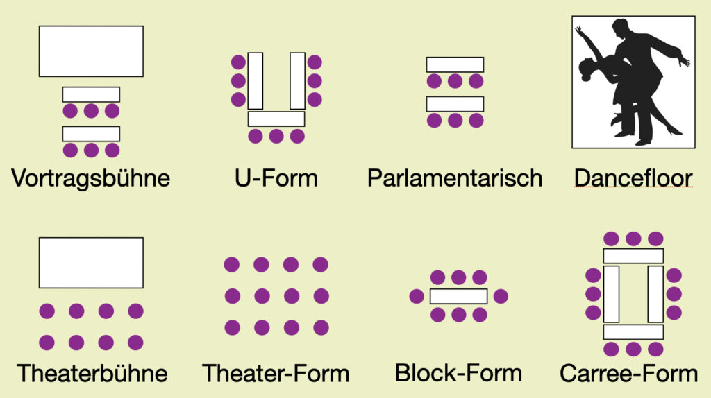 Vielfältige Möglichkeiten der Bestuhlung mit oder ohne Bühne, Service-Team/Catering und Video-/Audiosupport – dies und mehr ist möglich.